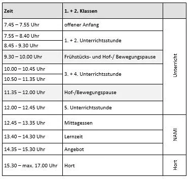 Der Unterricht für die Jahrgänge 1 und 2 endet täglich nach der fünften Stunde. Im Anschluss bieten wir – nach vorheriger Anmeldung – den Nachmittag (NAMI) mit Mittagessen, Lernzeit und abwechslungsreichen Angeboten an.