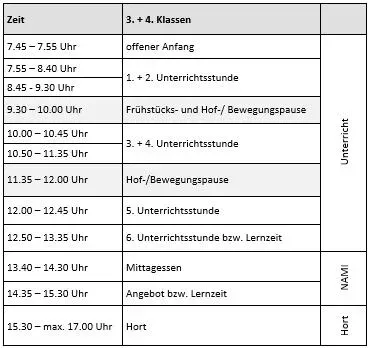 Für die Jahrgänge 3 und 4 endet der Unterricht täglich nach der 5. oder 6. Stunde. Im Anschluss können die Kinder – nach vorheriger Anmeldung – am Nachmittag (NAMI) mit Mittagessen, Lernzeit und abwechslungsreichen Angeboten teilnehmen.