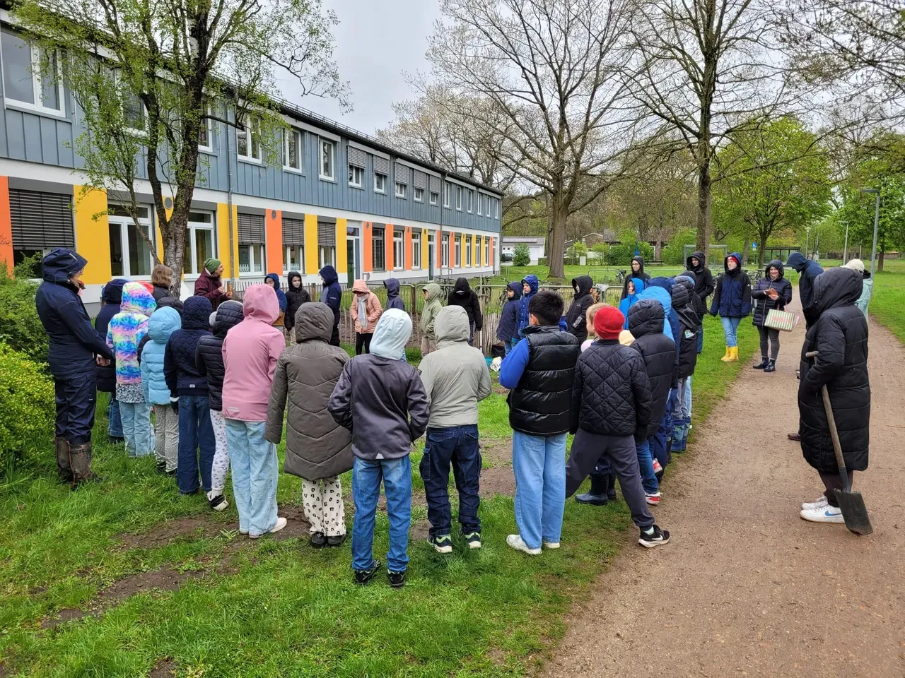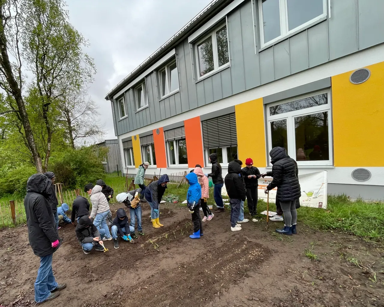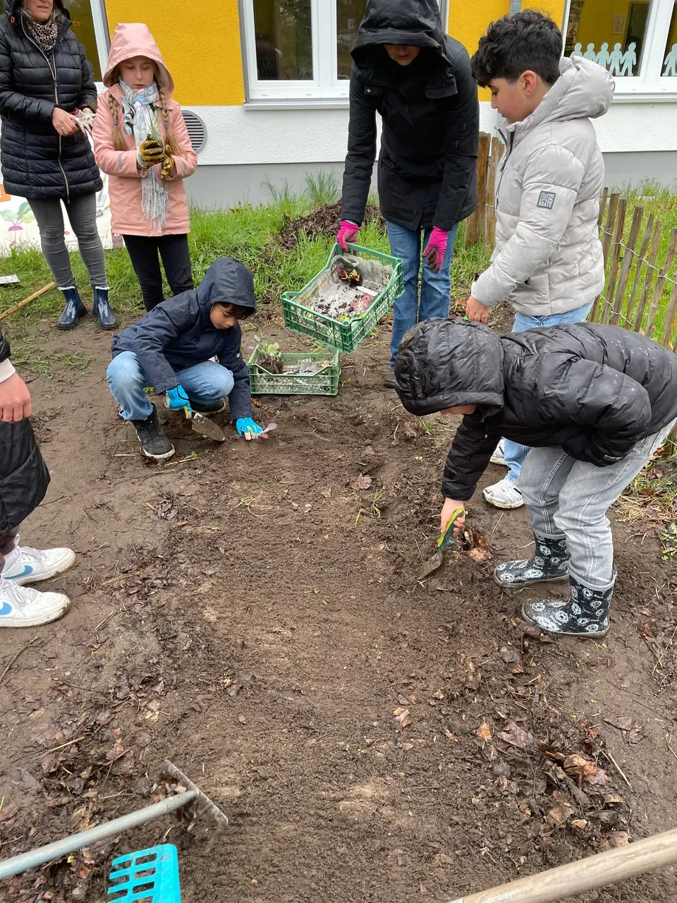 Am 20.4. haben die Klassen 3b und 3c mit tatkräftiger Unterstützung einiger Eltern und dem Ackercoach von Acker e.V. die Ackersaison nun so richtig eröffnet. Es wurde dem regnerischen Wetter und den kühlen Temperaturen getrotzt und fleißig gepflanzt und gesät. Kartoffeln, Bete, Palmkohl, Mangold, Kohlrabi, Frühlingszwiebeln und Romanasalat haben ihren Weg in die Erde genauso gefunden wie Kresse, Radieschen, Rauke, Möhren, Schwarzwurzel und Gemüsezwiebeln. Nun heißt es regelmäßig gießen, hacken und anhäufeln, bis die erste Ernte ansteht.