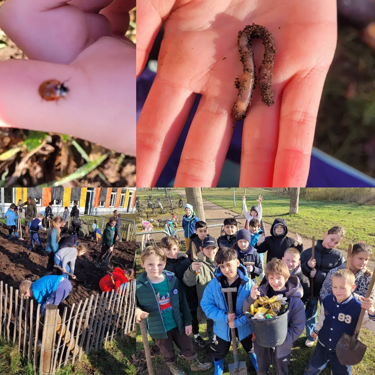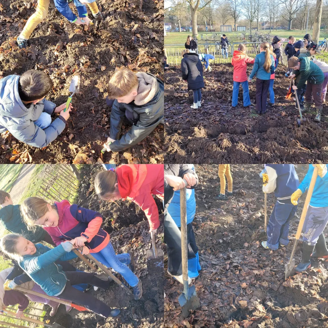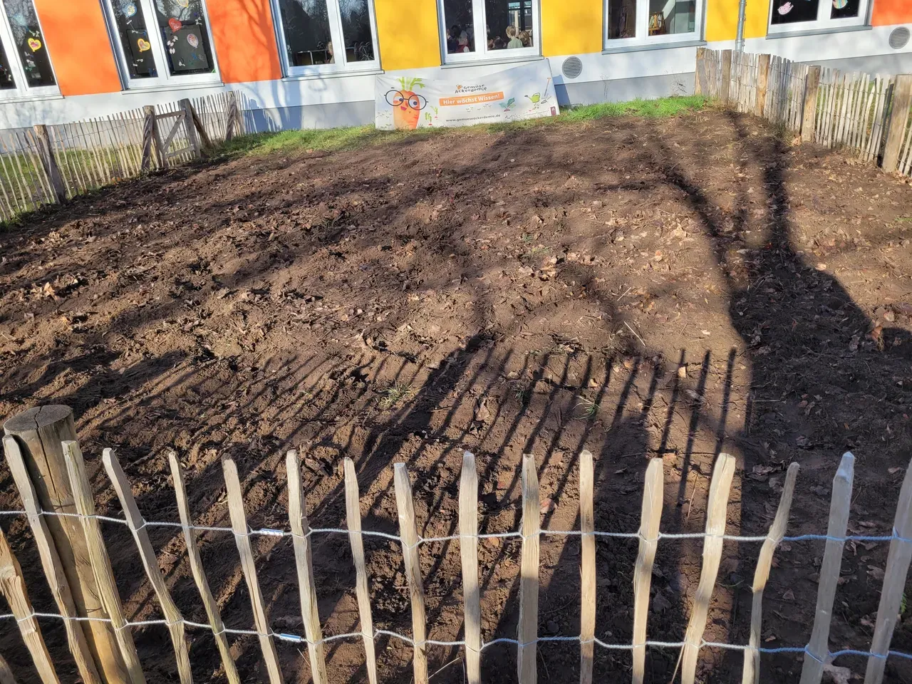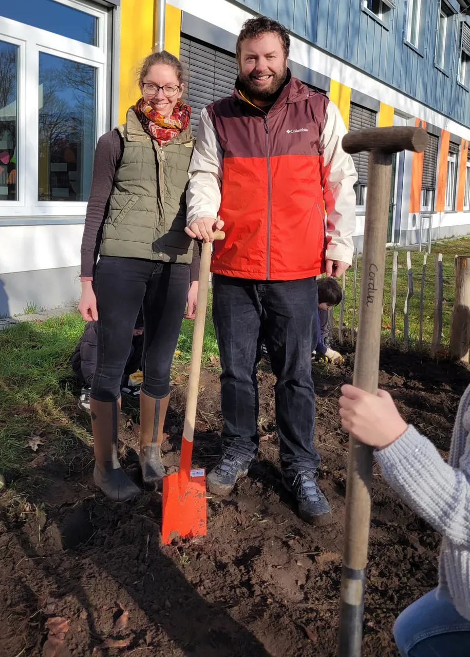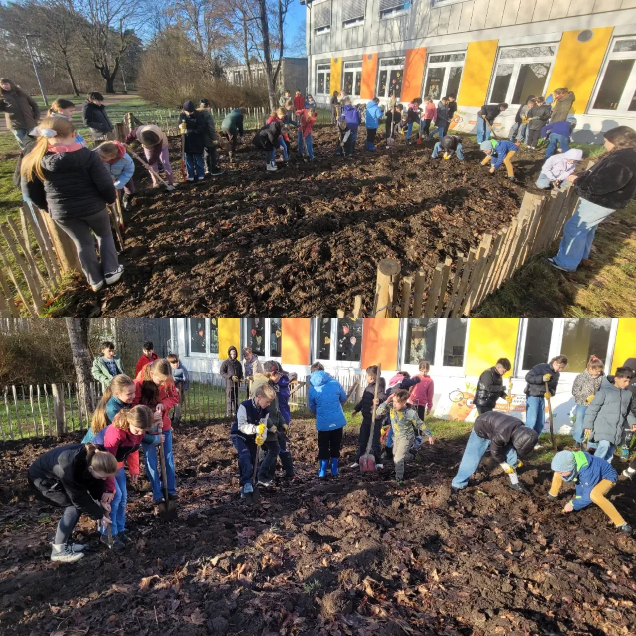 Tatkräftig ging es anschließend auf dem Schulacker weiter. Die beiden 3. Klassen gruben den Acker um. Mit eigenem Werkzeug, passenden Schuhen und viel Einsatzbereitschaft arbeiteten die Kinder zusammen mit ihren Lehrkräften an ihrem gemeinsamen Projekt. Der Schulacker ist Teil der „GemüseAckerdemie“, an der beide Klassen bereits seit über zwei Jahren teilnehmen.